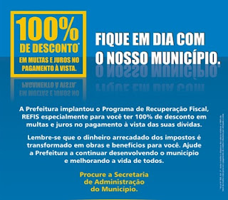 Já está em vigor no município de Iguatu o Programa Especial de Recuperação Fiscal – Refis 2013. O programa oferece a todos os contribuintes iguatuenses, condições de quitarem seus débitos com o município, através de descontos de até 100% de multas e juros. A Lei nº 1930/2013, aprovada pela Câmara Municipal, regulariza através de parcelamento de créditos tributários do município nas seguintes condições: Parcela Única – Para quitação da dívida a vista, no ato da adesão, com desconto de 100% do valor atualizado da multa e juros de mora. Em até três parcelas mensais sucessivas, com pagamento da primeira parcela no ato da adesão, com anistia de 50% das multas e juros.