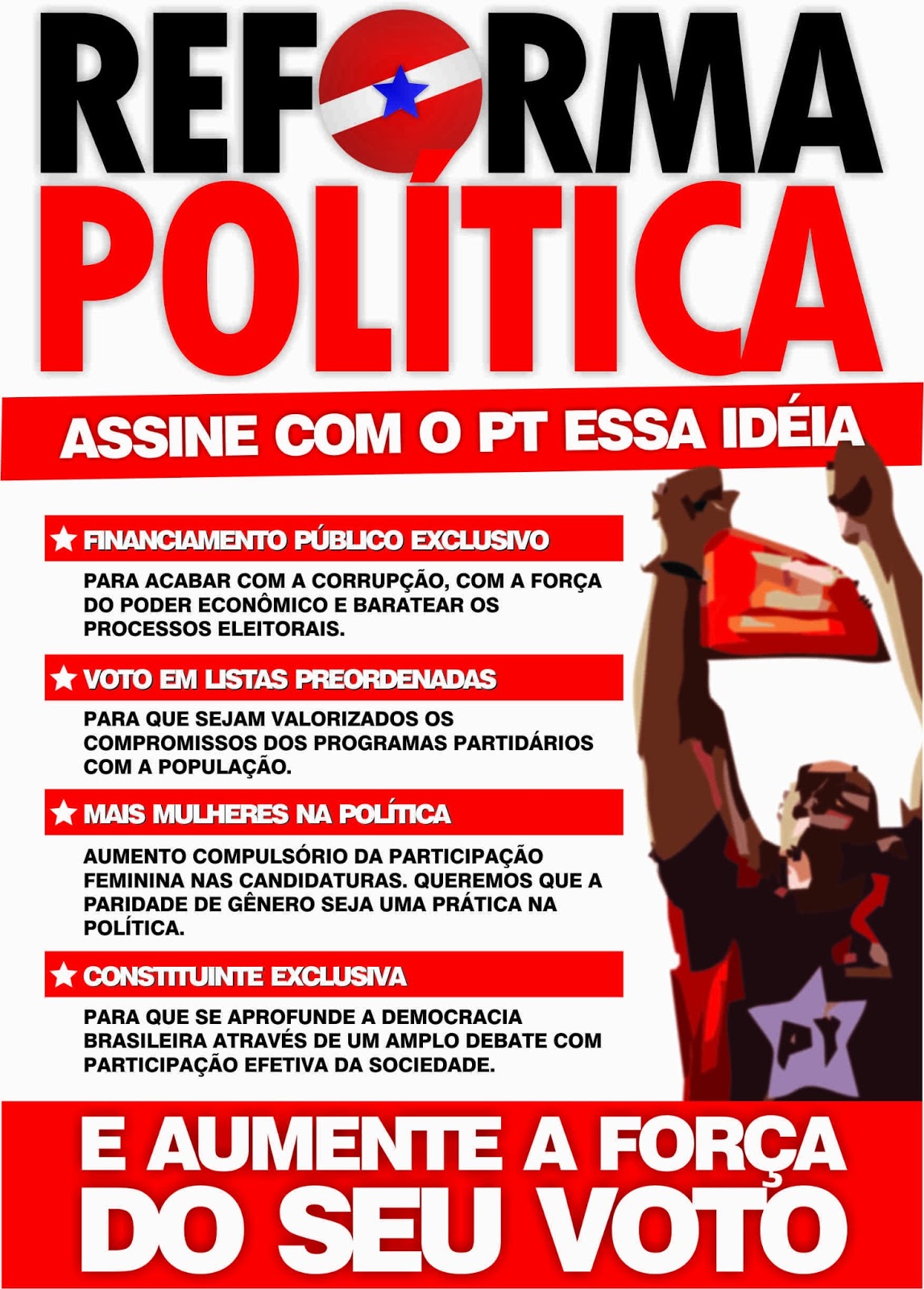O Partido dos Trabalhadores elaborou um projeto de iniciativa popular para coletar 1,5 milhão de assinaturas a fim de propor alguns pontos de mudança na nossa política. O PT já está nas ruas com uma campanha nacional em busca do apoio da sociedade. A partir de maio próximo será iniciada a 2ª etapa da campanha, com o objetivo de envolver toda a sociedade civil. A ideia é fazer do PT o protagonista da grande e necessária Reforma que certamente mudará os rumos das eleições em nosso país.