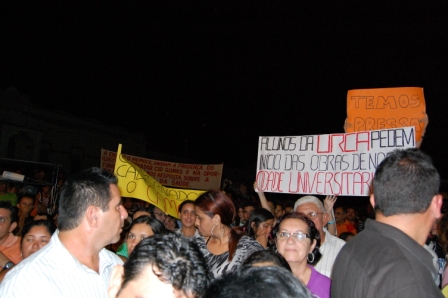 Por ocasião da vinda do governador Cid Gomesa ao município na quarta-feira, 07, quando assinou as ordens de serviços para construção da Policlínica Regional de Iguatu, Reforma e Ampliação do Hospital Santo Antônio dos Pobres, onde funcionará a 18ª CRES (Coordenadoria Regional de Saúde) e construção do Centro de Convenções, estudantes do campus da Urca em Iguatu reivindicaram ao gestor estadual a assinatura da ordem de serviço para a construção do Centro Universitário onde serão incluídas as faculdades: FATEC, URCA a UECE (Fecli). Com apitos, faixas e cartazes os estudantes com palavras de ordem cobraram do governador o inicio da construção desse espaço de educação superior.