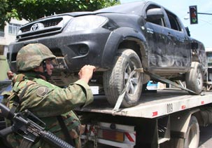 Vários veículos também estavam abandonados. Peças do motor de uma minivan Captiva, placas KXZ, do Rio de Janeiro, tinham sido retiradas. Hoje, a Polícia Civil apreendeu também uma picape Toyota Hyllux, com blindagem de nível 3, que teria sido abandonada por traficantes durante a fuga. O veículo havia sido furtado em junho deste ano e teve a placa clonada. De acordo com o delegado, a maioria dos veículos apreendidos é produto de furto. Para reclamar a devolução, os proprietários devem comparecer à Divisão, munidos de documentos.